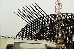 Le hall central situé transversalement à cet ensemble est recouvert d'une grande structure métallique formant deux ailes évasées de part et d'autre.