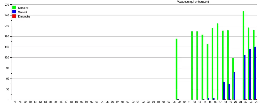 Le graphique et le tableau montrent le nombre de passagers qui en moyenne embarquent durant la semaine, le samedi et le dimanche[8].