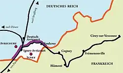 Lors de l'annexion de l'Alsace-Lorraine, à la suite de la signature du traité de Francfort le , le tracé de la nouvelle frontière fait que la gare d'embranchement et une partie de la ligne d'Igney - Avricourt à Cirey — exploitée par la Compagnie anonyme du chemin de fer d'intérêt local d'Avricourt à Blâmont et Cirey (ABC) — se retrouvèrent dans l'Empire allemand, empêchant ainsi leur fonctionnement normal[5],[2]. À la suite des doléances françaises, les Allemands acceptèrent de modifier, par une convention additionnelle signée à Berlin le , ladite frontière. Fixée sur six kilomètres le long même de la voie ferrée unique ABC et de celle à voie double de Paris – Strasbourg côté Lunéville[4], la nouvelle frontière permit le retour à la France de la commune d'Igney et la partie d'Avricourt située au sud de la voie ferrée[2] (plus les villages de Raon-lès-Leau et de Raon-sur-Plaine)[5]. Les portions de voies ci-dessus et les installations de la gare d'Avricourt (qui prend le nom d'Igney - Avricourt) redeviennent alors françaises[2].