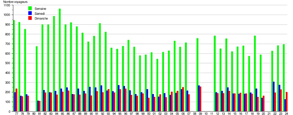 Ce graphique et tableau montre le nombre de voyageurs embarquant en moyenne durant la semaine, le samedi et le dimanche[14].