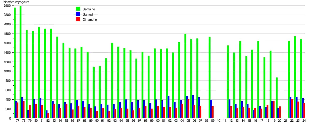 Ce graphique et tableau montre le nombre de voyageurs embarquant en moyenne durant la semaine, le samedi et le dimanche[13].
