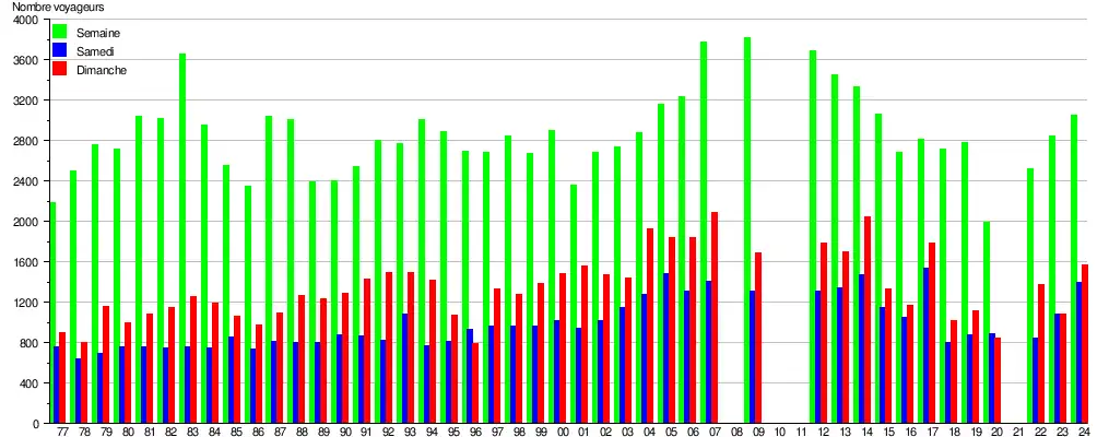 Ce graphique et tableau montre le nombre de voyageurs embarquant en moyenne durant la semaine, le samedi et le dimanche[6].