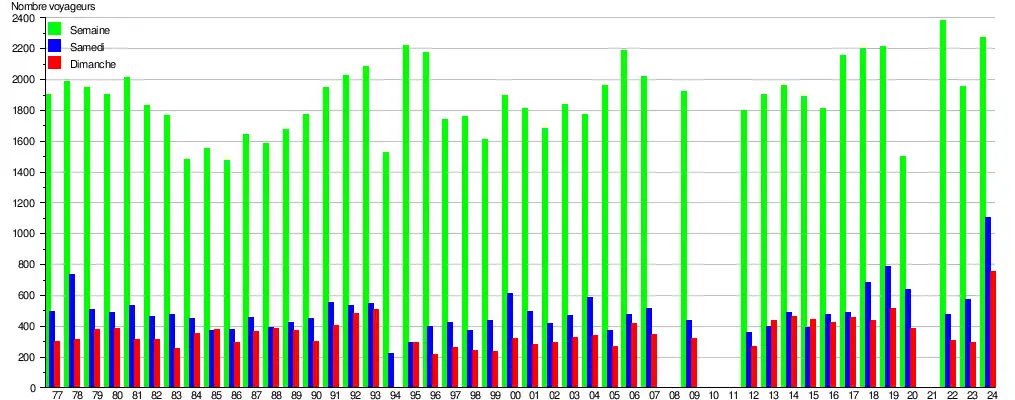 Ce graphique et tableau montre le nombre de voyageurs embarquant en moyenne durant la semaine, le samedi et le dimanche[11].