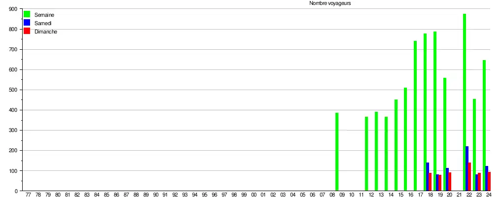 Ce graphique et tableau montre le nombre de voyageurs embarquant en moyenne durant la semaine, le samedi et le dimanche[11].