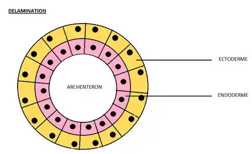 Elle consiste à une orientation des plans de divisions cellulaires qui s'orientent parallèlement sur la surface de la blastula. Ceci entraîne la formation d'un feuillet interne, dit endoderme. Chez l'oursin il s'agit de cellules de l'ectoderme qui se détachent et qui vont vers l'intérieur de l'embryon pour former l'endoderme en se rassemblant. Ce procédé est visible chez certains cœlentérés. Certains oursins font exception.