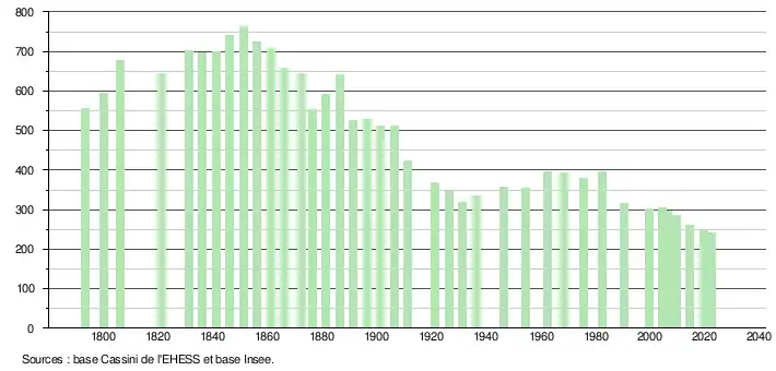| L'évolution du nombre d'habitants est connue à travers les recensements de la population effectués dans la commune depuis 1793. Pour les communes de moins de 10 000 habitants, une enquête de recensement portant sur toute la population est réalisée tous les cinq ans, les populations de référence des années intermédiaires étant quant à elles estimées par interpolation ou extrapolation[27]. Pour la commune, le premier recensement exhaustif entrant dans le cadre du nouveau dispositif a été réalisé en 2004[28]. En 2022, la commune comptait 241 habitants[Note 5], en évolution de −7,31 % par rapport à 2016 (Lot-et-Garonne : −0,18 %, France hors Mayotte : +2,11 %). |