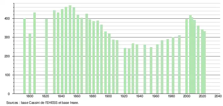 L'évolution du nombre d'habitants est connue à travers les recensements de la population effectués dans la commune depuis 1793. Pour les communes de moins de 10 000 habitants, une enquête de recensement portant sur toute la population est réalisée tous les cinq ans, les populations de référence des années intermédiaires étant quant à elles estimées par interpolation ou extrapolation[36]. Pour la commune, le premier recensement exhaustif entrant dans le cadre du nouveau dispositif a été réalisé en 2004[37].