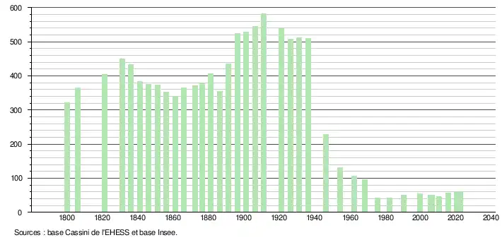 L'évolution du nombre d'habitants est connue à travers les recensements de la population effectués dans la commune depuis 1800. Pour les communes de moins de 10 000 habitants, une enquête de recensement portant sur toute la population est réalisée tous les cinq ans, les populations de référence des années intermédiaires étant quant à elles estimées par interpolation ou extrapolation[16]. Pour la commune, le premier recensement exhaustif entrant dans le cadre du nouveau dispositif a été réalisé en 2005[17].