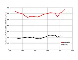 La consommation de gaz a baissé de 13 % en 2022. Le GNL a représenté 32 % de l'approvisionnement contre 19 % en 2021 et 2020. La part dans la production mondiale de la Russie est passé de 18 % à 15,5 % entre 2021 et 2022. Les États-Unis ont augmenté leurs part dans la production mondiale de 24 à 25 % en augmentant leur production de 41 milliards de mètres cubes cette année là. Le Moyen-Orient a augmenté sa production de 14 milliards de mètres cubes[16].