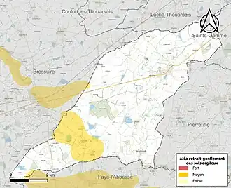 Les mouvements de terrains susceptibles de se produire sur la commune sont des tassements différentiels[15]. Le retrait-gonflement des sols argileux est susceptible d'engendrer des dommages importants aux bâtiments en cas d’alternance de périodes de sécheresse et de pluie[16]. 10,6 % de la superficie communale est en aléa moyen ou fort (54,9 % au niveau départemental et 48,5 % au niveau national)[Carte 2]. Depuis le , en application de la loi ELAN, différentes contraintes s'imposent aux vendeurs, maîtres d'ouvrages ou constructeurs de biens situés dans une zone classée en aléa moyen ou fort[Note 2],[17].