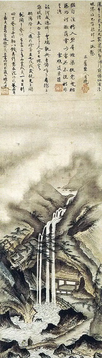 - Tōkyō (Nezu Mus.) : Le spectacle de la cascade, daté 1480, rouleau en hauteur, encre et couleurs sur papier, inscriptions de Osen Keisan et de deux autres prêtres.
