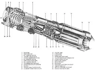 Les aubes de compresseur sont faites d'acier inoxydable et sont montées sur des disques (les 7 premiers étant faits de titane) et espacés avec des entretoises résistantes à la corrosion en acier (pas de l'inox)[9]. Le J79 produit un sifflement particulier à certains angles de manette de gaz. Cette particularité étrange donna au F-104B Starfighter de la NASA, le N819NA, le surnom de « Howling Holland »[10]. Les premières versions produisaient une épaisse fumée noire lorsque le moteur fonctionnait à mi-puissance et en croisière, ce qui s'est avéré être un désavantage pour les avions de combat qui en ont été équipés, car cela permettait de les repérer de loin. Certaines versions du réacteur ont toutefois reçu un dispositif réducteur de fumées.