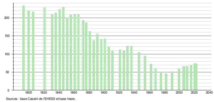 L'évolution du nombre d'habitants est connue à travers les recensements de la population effectués dans la commune depuis 1793. Pour les communes de moins de 10 000 habitants, une enquête de recensement portant sur toute la population est réalisée tous les cinq ans, les populations de référence des années intermédiaires étant quant à elles estimées par interpolation ou extrapolation[14]. Pour la commune, le premier recensement exhaustif entrant dans le cadre du nouveau dispositif a été réalisé en 2005[15].