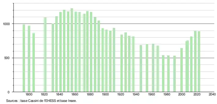 L'évolution du nombre d'habitants est connue à travers les recensements de la population effectués dans la commune depuis 1793. Pour les communes de moins de 10 000 habitants, une enquête de recensement portant sur toute la population est réalisée tous les cinq ans, les populations de référence des années intermédiaires étant quant à elles estimées par interpolation ou extrapolation[15]. Pour la commune, le premier recensement exhaustif entrant dans le cadre du nouveau dispositif a été réalisé en 2007[16].