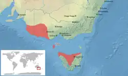 Cette espèce est endémique du Sud-Est de l'Australie[1],[2]. Elle se rencontre dans le sud-ouest du Victoria, dans l'extrême Sud-Est de l'Australie-Méridionale, sur King Island et en Tasmanie.