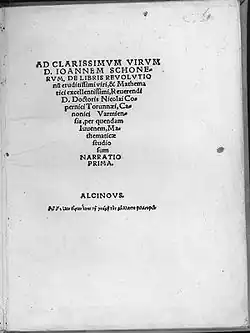 Rheticus, bien que malade un temps, prend rapidement connaissance du manuscrit de Copernic. En , il le synthétise avec brio dans un rapport qu'il adresse à Johannes Schöner, à Nuremberg[13]. En 1540 il se rend à Dantzig (Gdańsk) pour faire imprimer l'envoi à Schöner, c'est la Narratio prima (le premier rapport) : la première fois qu'est imprimée une présentation du modèle héliocentrique de Copernic. L'opuscule est dédié à Johann Schöner, et présente les travaux du « Docteur Nicolas Copernic de Thorn »[18]. Mais Rheticus a préféré rester un anonyme « jeune étudiant de mathématiques »[19]. La brochure est un succès. Par l'intermédiaire de Gasser, elle sera réimprimée à Bâle en 1541, cette fois-ci sous le nom de Rheticus[20],[21].