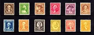 | 1932 | 12 timbres-poste bicentenaire | Au-dessus « UNITED STATES POSTAGE » en dessous « 1732-1932 WASHINGTON CENTS » | Dentelé | ![]() | Bureau of Engraving and Printing | [5],[6] | |