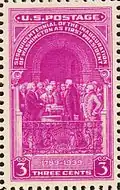 | 1939 | 3¢ violet, « Washington taking Oath » | Au-dessus « U.S. POSTAGE » en dessous « 1789-1939 3 THREE CENTS 3 » | Dentelé | ![]() | Bureau of Engraving and Printing | [note 11] | |