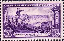 - ↑ Washington qui sauve son armée à Brooklyn, dirigeant ses troupes à la maison de Fulton Ferry, a été commémoré par ce timbre de 3¢ au 175e anniversaire. Les troupes en arrière-plan traversent l'East River.