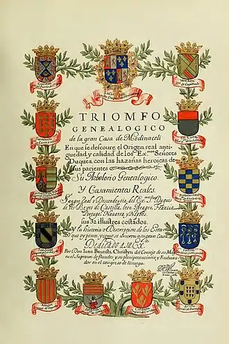 - Triomfo genealogico de la gran Casa de Medinaceli en que se descovre el origen real antiguedad y calidad de los Exmos Señores Duques, con las hazañas heroicas de sus parientes, su arbolorio genealogico y Casamientos Reales, San gre Real o descendentia de Exmos. Srs. Duques de los Reyes de Castilla, Leon, Aragon, Francia, Portugal, Navarra y Napoles.. G. H. Wilmart scribebat anno 1680. Décrit dans Paz y Mélia 1922 p. 24. Tolède, Archivo Ducal de Medinaceli.