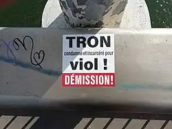 Autocollant demandant la démission de Georges Tron après sa condamnation (pont de la Première-Armée-Française de Juvisy-sur-Orge, ).