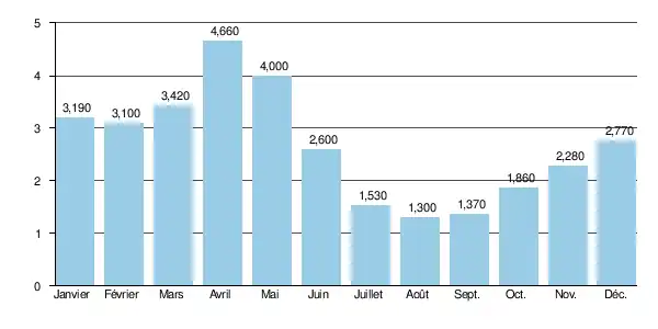 Les crues, quant à elles, sont très importantes quand elles se produisent. Les QIX 2 et QIX 5 valent respectivement 32 et 44 m3/s. Le QIX 10 est de 52 m3/s, le QIX 20 de 60 m3/s et le QIX 50 de 70 m3/s.