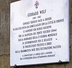 Après un doctorat de philosophie, Gerhard Wolf rejoint le ministère des Affaires étrangères de la République de Weimar en 1927. Posté à Rome au moment de l'accession au pouvoir d'Adolf Hitler, il ne rejoint le parti nazi qu'en 1939, et cela parce que sa carrière en dépend. Nommé consul à Florence en 1940, il joue un rôle important au moment de l'occupation allemande de l'Italie. Il utilise alors son pouvoir pour sauver de nombreux juifs italiens, parmi lesquels l'historien Bernard Berenson, et pour protéger de nombreuses œuvres d'art. Il sauve ainsi de la destruction le Ponte Vecchio.