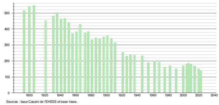 L'évolution du nombre d'habitants est connue à travers les recensements de la population effectués dans la commune depuis 1793. Pour les communes de moins de 10 000 habitants, une enquête de recensement portant sur toute la population est réalisée tous les cinq ans, les populations de référence des années intermédiaires étant quant à elles estimées par interpolation ou extrapolation[21]. Pour la commune, le premier recensement exhaustif entrant dans le cadre du nouveau dispositif a été réalisé en 2004[22].