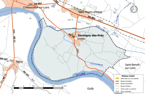 La commune de Germigny-des-Prés se trouve dans le centre du département du Loiret, dans la région agricole du Val de Loire[3] et l'aire urbaine d'Orléans[4]. À vol d'oiseau, elle se situe à 27,6 km d'Orléans[5], préfecture du département, et à 4,0 km de Châteauneuf-sur-Loire, ancien chef-lieu du canton dont dépendait la commune avant . La commune fait partie du bassin de vie de Châteauneuf-sur-Loire[4].