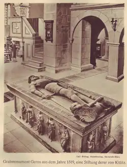 À la mort de Gero, sa marche s’étendait jusqu’à la rivière Neisse. Il n’était pas très apprécié par la noblesse saxonne de son époque car il n’était pas issu d’une grande famille et car il était d’une grande droiture morale[14]. Néanmoins, il est loué dans La Chanson des Nibelungen comme le marcgrâve Gêre, bien que certains historiens pensent qu’il n’a jamais porté ce titre officiellement[15]. La tombe de Gero est encore visible aujourd’hui à Gernrode. Une peinture décorative y a été ajoutée vers 1350. Elle montre Gero et un Wende vaincu[16].