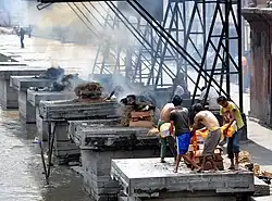 Il existe aussi des ghats de shmashana (ghats de crémation) où les corps sont incinérés au bord de l'eau, ce qui permet aux cendres d'être emportées par la rivière.