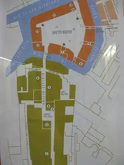 Le , le sénateur Zaccaria Dolfin propose de les confiner sur une île dans le quartier de Cannaregio. Le , le Sénat de la république de Venise publie un décret pour fondation du ghetto dans ce quartier[14]. Le choix du site est déterminé par sa situation à la périphérie de la ville et par le fait qu'il n'abrite pas d'église chrétienne et qu'il est facile à contrôler grâce à la construction de deux portes qui sont fermées le soir[15]. Les Juifs sont parqués la nuit[16] autant pour les protéger que pour les surveiller[17]. Ils doivent en outre porter un habit distinctif, une rouelle jaune remplacée quelques années plus tard par un béret de la même couleur[1]. La communauté devra également s’acquitter chaque année de la somme de 14.000 ducats. La résidence dans ce quartier est également imposée aux Juifs vénitiens dans le but de subir une prédication forcée par les ordres prêcheurs et mendiants, un courant théologique minoritaire, mais appuyé par plusieurs décisions papales affirmant que la parousie aurait lieu une fois que tous les Juifs auront été convertis au christianisme[18].