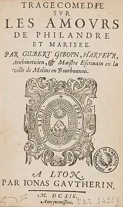 - Tragécomedie[3] sur les Amours de Philandre et Marisée. Par Gilbert Giboin, harpeur, arithmeticien, & maistre escrivain en la ville de Molins en Bourbonnois. Lyon : Jonas Gautherin, 1619. 8°, 95-[1] p. Paris Ars. : 8 BL 14159. Numérisé sur Gallica. Cf. Cioranescu t. 2 n° 32981. Œuvre dédiée à l'écrivain Honoré d'Urfé, avec dans les pièces liminaires des stances de Michel Antoine Gaigneu dédiées à l'auteur.