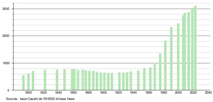 L'évolution du nombre d'habitants est connue à travers les recensements de la population effectués dans la commune depuis 1793. Pour les communes de moins de 10 000 habitants, une enquête de recensement portant sur toute la population est réalisée tous les cinq ans, les populations de référence des années intermédiaires étant quant à elles estimées par interpolation ou extrapolation[20]. Pour la commune, le premier recensement exhaustif entrant dans le cadre du nouveau dispositif a été réalisé en 2008[21].