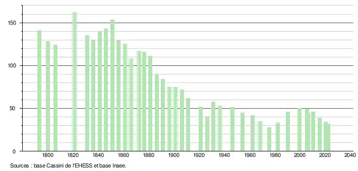 L'évolution du nombre d'habitants est connue à travers les recensements de la population effectués dans la commune depuis 1793. Pour les communes de moins de 10 000 habitants, une enquête de recensement portant sur toute la population est réalisée tous les cinq ans, les populations de référence des années intermédiaires étant quant à elles estimées par interpolation ou extrapolation[16]. Pour la commune, le premier recensement exhaustif entrant dans le cadre du nouveau dispositif a été réalisé en 2005[17].