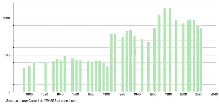 L'évolution du nombre d'habitants est connue à travers les recensements de la population effectués dans la commune depuis 1793. Pour les communes de moins de 10 000 habitants, une enquête de recensement portant sur toute la population est réalisée tous les cinq ans, les populations de référence des années intermédiaires étant quant à elles estimées par interpolation ou extrapolation[17]. Pour la commune, le premier recensement exhaustif entrant dans le cadre du nouveau dispositif a été réalisé en 2008[18].