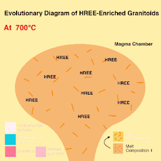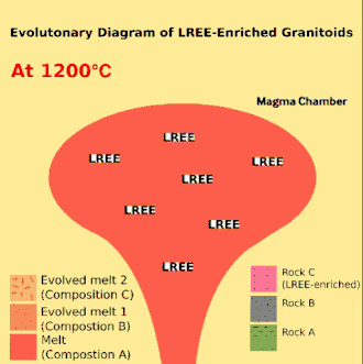 Diagramme évolutif montrant la première étape du processus d'enrichissement en terres rares légères par différenciation du magma[1]. Les granitoïdes enrichis en éléments légers des terres rares sont formés par la différenciation du magma, qui fractionne progressivement la composition du magma en couches chimiquement distinctes au cours de son processus de refroidissement[1]. Comme les ETR sont des éléments incompatibles (moins enclin à être incorporés dans la structure des cristaux de solidification), ils restent sous forme fondue dans la chambre magmatique jusqu'à la dernière étape de refroidissement. Par conséquent, la dernière et la plus haute fraction de granitoïde est fortement enrichie en ETR[1].