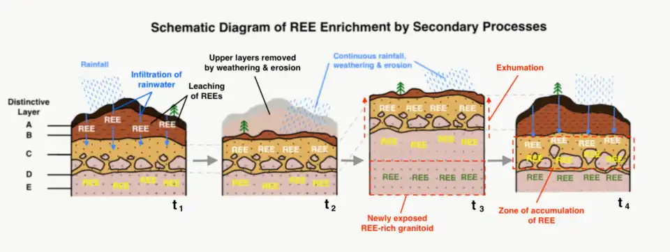 Le processus secondaire (c'est-à-dire l'altération) est essentiel à l'enrichissement ultérieur des granitoïdes riches en éléments de terres rares légers et lourds. Il transforme le granitoïde en un corps minéralisé rentable à extraire. Par conséquent, le climat chaud et humide, associé à un sol légèrement acide dans les zones subtropicales, favorise la formation de gisements. Une combinaison d'altérations chimiques, physiques et microbiologiques intenses[13] permet l'élimination des ETR dans la couche supérieure, plus acide, complètement altérée, puis la migration vers le bas avec l'eau de pluie et, éventuellement, le dépôt (et la concentration) dans la couche inférieure, moins acide et modérément altérée[16],[24],[25],[26]—Les terres rares forment un complexe plus stable dans le sol de pH plus élevé—[20].