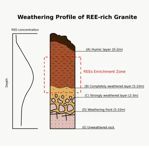 Des gisements d'éléments de terres rares hébergés par des régolithes se trouvent le long des crêtes des collines granitiques basses du sud de la Chine[10]. Le gisement de minerai peut être établi en quatre couches en fonction de son degré d'altération dont la plus inférieure du sol dégradé contient les corps minéralisés[11],[12],[13],[3],[14].