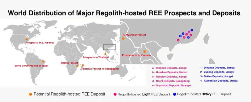 Actuellement, la Chine domine plus de 95% de la production mondiale d'ETR[7]. Les gisements d'éléments de terres rares dans les régolithes, qui contribuent à 35% de la production chinoise d'ETR, se trouvent principalement dans le sud de la Chine[8].