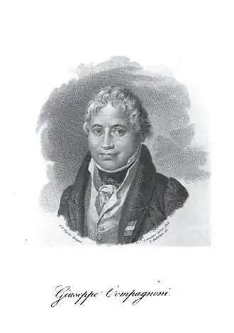 Né à Lugo en Émilie-Romagne, en 1754, Compagnoni embrassa de bonne heure l’état ecclésiastique. Dès l’âge de quinze ans, il avait publié des poésies et ensuite des ouvrages en prose, parmi lesquels nous indiquerons la dissertation sur la préférence qu’on doit donner à la poésie rimée. Le jeune Giuseppe avait fait précéder cette dissertation du poème de Mariano Capra, intitulé : l’Incendio della Rocca di Lugo. La troisième production de Compagnoni est le poème sur la fiera di Sinigalia, qui fut critiqué par Giovanni Ristori, rédacteur des Mémoires encyclopédiques de Bologne. Le jeune Compagnoni répondit au journaliste, devint son ami, son collaborateur, et, en 1785, directeur pendant l’absence de Ristori de Bologne. En 1786, il se rendit à Turin avec le marquis Bentivoglio de Ferrare, et y publia une lettre en vers sur la fin tragique de Caterina Boccabadati, femme du célèbre Francesco Albergati Capacelli. En 1787, arrivé avec Bentivoglio à Venise, il accepta la rédaction du journal imprimé par Graziosi, sous le titre de Notizie del mondo, qui fut bientôt regardé comme la meilleure des feuilles publiques d’Italie. Il publia à la même époque, avec Albergati, Lettere piacevoli se piaceranno, Modène, 1791, in-8°. En 1792, il fit paraître Saggio sugli Ebrei e sui Greci, ouvrage dans lequel il met les Juifs au-dessus des Grecs pour la littérature, et qu’il avait composé sur l’invitation de riches Israélites, qui l’en récompensèrent généreusement et en firent imprimer successivement trois éditions. Compagnoni en publia une quatrième en 1806. Dès son apparition, ce livre avait été critiqué par l’abbé Rubbi, à Turin, qui prit la défense des Grecs, et, à Milan, par l’abbé Guillon. Compagnoni s’occupa ensuite de la traduction de Caton, De agri cultura. En 1796, il se rendit à Milan auprès du général Bonaparte, et fut nommé membre du conseil législatif de la république cisalpine, où il prononça (le 15 germinal an 6), en faveur de la polygamie , un discours qui fut réfuté par deux de ses collègues, Lamberti et Glissenti. Il rédigea pendant dix mois, à Venise, un nouveau journal, intitulé Mercurio d’Italia, dans lequel il faisait un tableau favorable de la révolution, et publia dans la même ville : Elementi di diritto costituzionale democratico ossia principj di giuspubblico universale, 1797, in-8° ; puis l’Epicarmo, ossia lo Spartano dialogo di Platone ultimamente scoperto. Après la paix de Tolentino, il fut nommé secrétaire général de la république cispadane, et ensuite député au congrès de Reggio et de Modène. Ses Considerazioni sulle tasse lui valurent le titre de professeur de droit constitutionnel à l’Université de Ferrare. À la chute de la république cisalpine, lors de l’invasion de l’Italie par les Austro-Russes, en avril 1799, Compagnoni se réfugia en France. Arrivé à Grenoble, il adressa aux habitants une harangue démocratique en italien, et se rendit à Paris, où il fit paraître un ouvrage intéressant, les Veglie del Tasso, qui fut traduit en français par Mimaut et par Barère. Après la bataille de Marengo, Compagnoni fut nommé promoteur de l’instruction publique à Milan, et comme tel chargé de faire le discours sur la paix de Lunéville, lors de la pose de la première pierre du forum Bonaparte[1]. Nommé ensuite secrétaire du corps législatif, puis membre du conseil d'État, il parvint encore à d’autres fonctions éminentes, et publia l’éloge funèbre du comte Mosca, son collègue. Lorsque Napoléon proclama le royaume d’Italie, Compagnoni dressa le procès-verbal ; l’empereur en fut très-satisfait ; il le nomma chevalier de la Couronne de fer ; et, ayant appris qu’il était né à Lugo : « Je ne croyais pas, dit-il, que de ces marécages eût pu sortir un si beau talent. » À la Restauration, Compagnoni se retira de la scène politique. Il mourut à Milan, le .