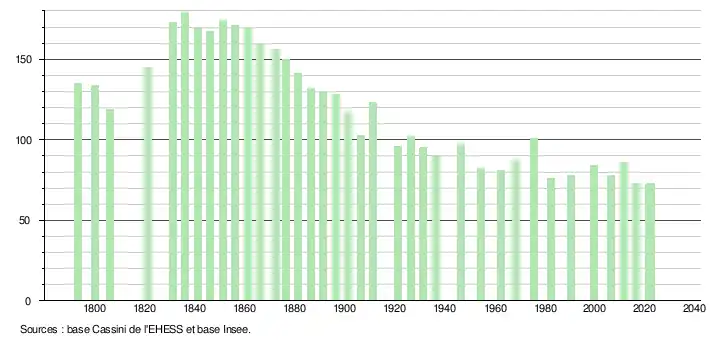 L'évolution du nombre d'habitants est connue à travers les recensements de la population effectués dans la commune depuis 1793. Pour les communes de moins de 10 000 habitants, une enquête de recensement portant sur toute la population est réalisée tous les cinq ans, les populations de référence des années intermédiaires étant quant à elles estimées par interpolation ou extrapolation[37]. Pour la commune, le premier recensement exhaustif entrant dans le cadre du nouveau dispositif a été réalisé en 2006[38].