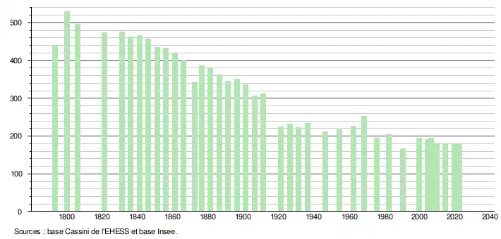 L'évolution du nombre d'habitants est connue à travers les recensements de la population effectués dans la commune depuis 1793. Pour les communes de moins de 10 000 habitants, une enquête de recensement portant sur toute la population est réalisée tous les cinq ans, les populations de référence des années intermédiaires étant quant à elles estimées par interpolation ou extrapolation[16]. Pour la commune, le premier recensement exhaustif entrant dans le cadre du nouveau dispositif a été réalisé en 2004[17].