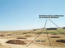 - les glacis alluviaux : où la roche en place est masquée par une épaisseur d'alluvions faible (glacis d'épandage) ou forte (glacis d'accumulation ou glacis d'ennoyage). Les glacis sont souvent creusés, selon leur pente, de rigoles peu profondes appelées rills, selon le processus d'érosion en nappe[4].