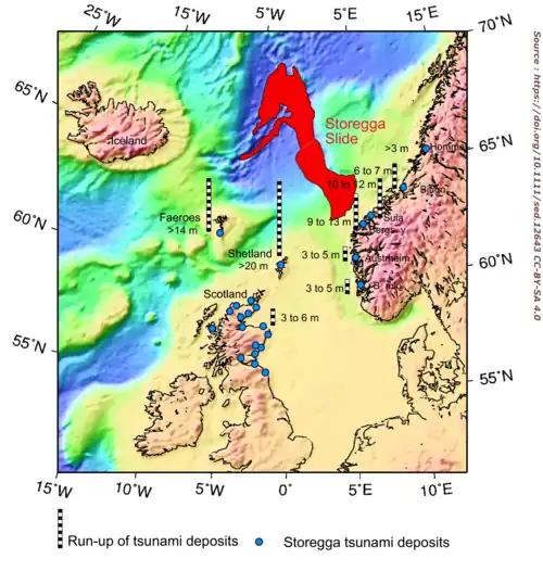 - le Doggerland : cette région basse (alors habitée[réf. souhaitée]) située entre le Danemark et l'Angleterre et maintenant engloutie par la mer du Nord a été balayée par le tsunami induit par cet effondrement[10],[52]. La première preuve du passage du tsunami dans le Doggerland au sud de l'actuelle mer du Nord a été publiée fin 2020 et selon les auteurs de l'article, elle suggère que les effets de ce tsunami dans le Doggerland sont à nuancer ou repenser en intégrant dans les modèles les variations de la topographie locale telle qu'elle existait alors[53]. Cela permettrait de mieux intégrer cet évènement dans les études de peuplement préhistorique de la région[53] ;