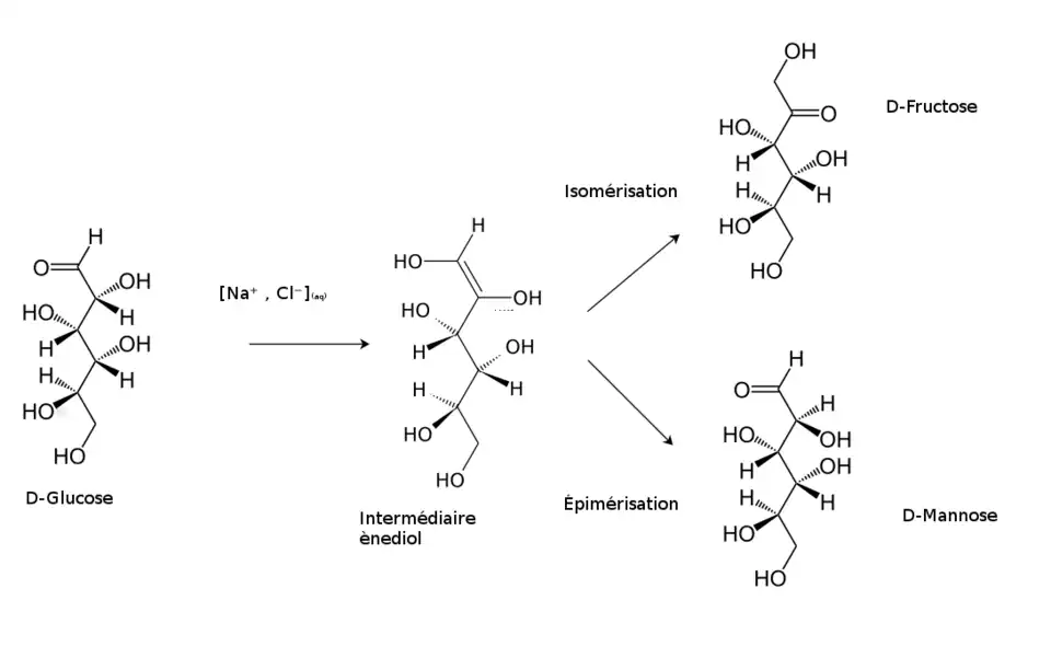 Cette tautomérie génère l'interconversion des oses. Par exemple, en milieu fortement basique (une solution d'hydroxyde de sodium), le D-glucose s'isomérise en D-fructose ou s'épimérise en D-mannose, moyennant une forme transitoire cis-ènediol.