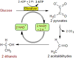1) l'une, en milieu anaérobie, appelée fermentation, se fait par phosphorylation au niveau du substrat et acceptation d'électrons par une substance organique. Il en existe de plusieurs sortes : fermentation lactique (qui se produit dans le muscle non oxygéné), fermentation butyrique, fermentation alcoolique[7]. Dans la fermentation lactique, le pyruvate est réduit directement par le NADH en lactate. Dans la fermentation alcoolique provoquée par des levures, la glycolyse se prolonge par deux réactions supplémentaires : la décarboxylation du pyruvate en acétaldéhyde puis la réduction de ce dernier en éthanol. C'est donc dans le premier cas, le pyruvate qui sert d'accepteur final d'électrons et l'acétaldéhyde dans le second cas.