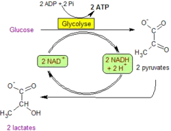 • Sinon en absence d'oxygène, le pyruvate peut être réduit en lactate grâce à l'oxydation couplée du NADH+H+ en NAD+. Ce processus nommé fermentation lactique, se rencontre aussi chez certains micro-organismes, comme les bactéries lactiques utilisées dans la fabrication du yaourt.