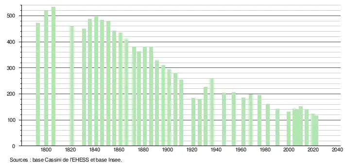 L'évolution du nombre d'habitants est connue à travers les recensements de la population effectués dans la commune depuis 1793. Pour les communes de moins de 10 000 habitants, une enquête de recensement portant sur toute la population est réalisée tous les cinq ans, les populations de référence des années intermédiaires étant quant à elles estimées par interpolation ou extrapolation[33]. Pour la commune, le premier recensement exhaustif entrant dans le cadre du nouveau dispositif a été réalisé en 2004[34].