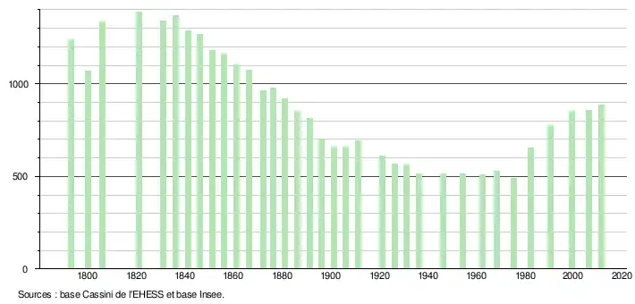 - ↑ Dans le tableau des recensements et le graphique, par convention dans Wikipédia, le principe a été retenu, pour les populations légales postérieures à 1999 de n’afficher dans le tableau des recensements et le graphique que les populations correspondant à l'année 2006, première population légale publiée calculée conformément aux concepts définis dans le décret no 2003-485 du 5 juin 2003, et les années correspondant à une enquête exhaustive de recensement pour les communes de moins de 10 000 habitants, ainsi que la dernière population légale publiée par l’Insee.